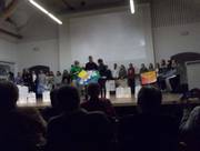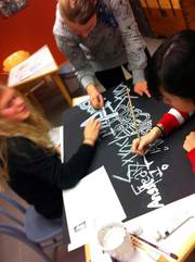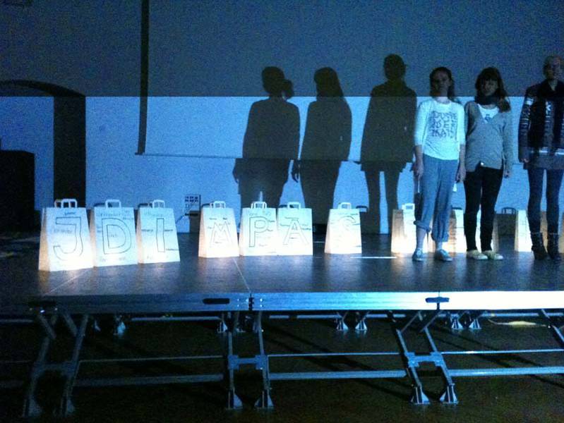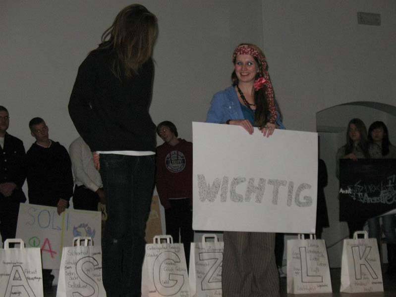 Unser zweites Kunstprojekt war ein Improvisations-Theaterstück. Während der Präsentation wurde nicht geredet, im Hintergrund lief ein Video mit Bildern von der heutigen Welt: überfüllte U-Bahnen, abgerissene Häuser, endlose Straßen...unterlegt mit Musik von vor 300 Jahren. Das Thema war wie man sich verhält, wenn jemand aus einer Gruppe entfernt wird und man nicht weiss, was als nächstes passiert. Wir waren in kleine Gruppen aufgeteilt und im Laufe des Stückes wurden unterschiedliche Gruppenmitglieder von zwei „Polizisten“weggenommen und in ein „Gefängnis“gesteckt. Gegen Ende mussten wir uns dann entscheiden: wollen wir sie befreien oder lieber in Sicherheit bleiben? Das Faszinierende an dem Stück war, dass es jedes Mal ein anderes Ende gab. Wir sollten versuchen, uns in die Situation der Menschen im Dritten Reich hineinzufühlen und zu überlegen, wie wir gehandelt hätten.
