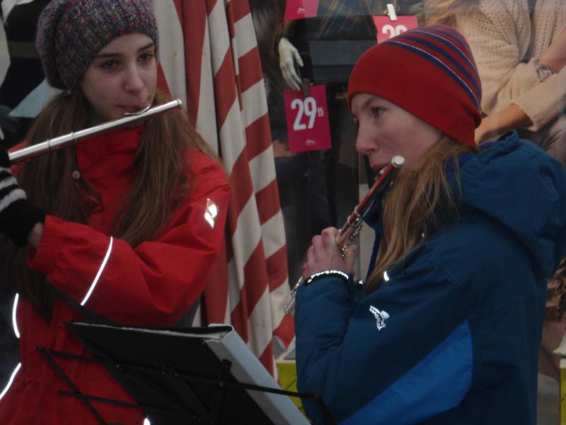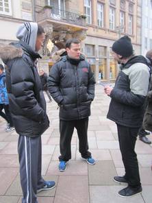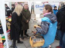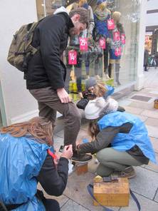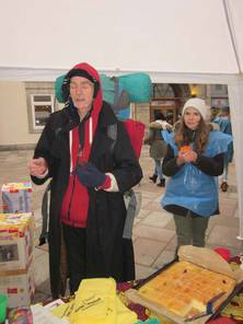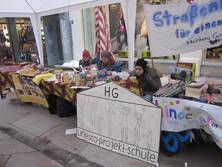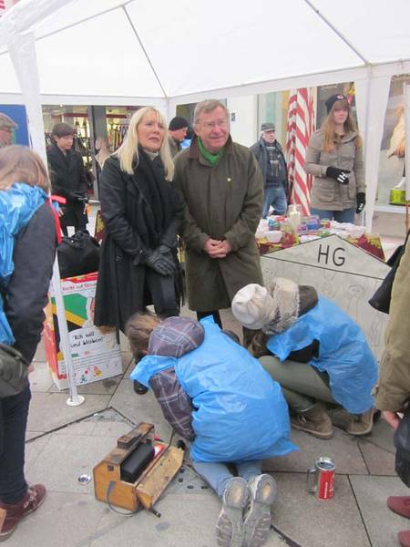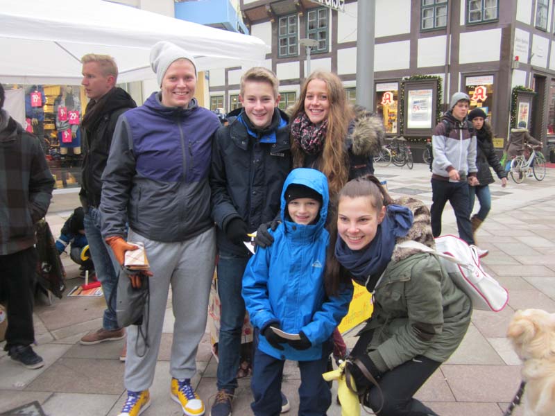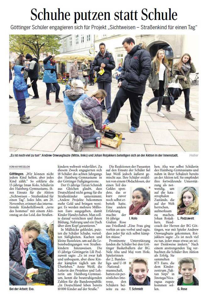 Nach dem die letzten Dinge gekauft und Kuchen fleißig gebacken war, ging es für uns los. Schnell war unser Stand aufgebaut und vorbereitet, da wurden auch schon die ersten Passanten um Spenden gebeten oder zu unserem Stand geführt. Die ersten zwei Stunden zogen sich in die Länge, die Spendendosen füllten sich schleppend und kaum jemand hörte uns überhaupt einen Moment zu. Sobald mich die Passanten im Müllsack mit Spendendose in der Hand sahen, machten sie einen Bogen um mich. Am Deprimierensten war, dass man mehr als ein „Hallo! Verzeihen sie...“ meistens nicht sagen konnte, denn schon hatten sie einen abgewimmelt mit „ Keine Zeit“, „Hab mein Geld nicht dabei“, ein einfaches Handzeichen, welches mir zu verstehen gab, dass sie kein Interesse hatten oder einfach geradeaus an mir vorbei laufen wollten. So gerne hätte ich den Leuten erzählt, wie wichtig ihre Spende oder was überhaupt unser Anliegen ist… Doch abgesehen von der eisigen Kälte und dem stundenlangen Schuhe putzen, gab es heute auch wirklich tolle Sachen: Zum einen waren wirklich viele Leute da, wie das Stadtradio Göttingen, das Göttinger Tageblatt inklusive Fotografen, unser Bürgermeister Uli Holefleisch und die Bürgermeisterin Frau Behbehani, Frau Kara von Art la dance, Maj vom Hofe, Nele Aha und eine weitere Top-Spielerin, Claudia Gruzien, der 2. Bundesliga Basketball Damen, ein Spieler und der Trainer Johann Roijakkers der 2. Bundesliga Basketball Herren der BG Göttingen und noch weitere, die ich vergessen habe. Mich hat es sehr berührt, als ein Mann an den Stand kam, mit einem großen Rucksack. Wir fragten ihn nach einer Spende, doch er erzählte uns, dass er selbst auf der Straße lebe und uns leider nichts geben könne. Frau Weiß bot im Kuchen an, er nahm ein kleines Stück Brownie und bedankte sich herzlich. Anschließend sagte er, dass er jetzt ein bisschen „schnorren“ gehe wolle und uns, wenn er etwas bekomme, es dann bei uns spenden würde. Als der Stand fast vollständig abgebaut war, erkannte ich den Mann erneut und er erzählte mir, dass er nicht genug bekommen hatte ( beim Betteln ) und uns deswegen nichts spenden könne. Ich fand den Tag sehr interessant, da man sich mit der eisigen Kälte und dem Schuhe putzen sehr gut in die Lage eines Straßenkindes hineinversetzen konnte. Ich hoffe durch die vielen, vielen Spenden geht es Straßenkindern ein bisschen besser. (Pauline)