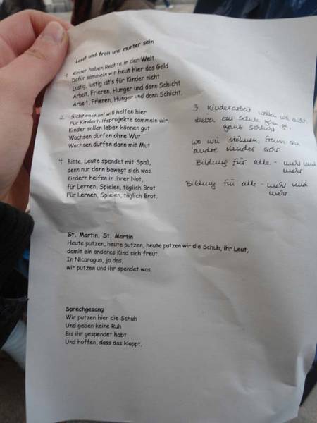 Es fing alles um 10:00 Uhr an. Das Verlagern der Gegenstände und die Sachen für unseren Infostand, darunter Pinnwände, Kuchen u.s.w., war eine ganz schöne Ackerei. Uns stand glücklicherweise ein Lieferwagen zur Verfügung, der schon mal einiges abnahm. Sonst gab es keine Schwierigkeiten bei dem Aufbau unseres Standes, der alles mögliche umfasste. Ich hatte mit einer Freundin (ebenfalls WPU UNESCO)einen kleinen Stand zum Thema "Kinder für Kinder". Hierbei sollten Kinder bzw. ihre Eltern für ein kleines Spiel bei dem man Trostpreise und Hauptpreise gewinnen konnte im Gegenzug Spenden in eine kleine verblompte Spendendose geben. Eigentlich eine sehr geschickte Idee, doch die meisten Erwachsenen blieben stur, sodass sie nicht einmal ein Geschenk angenommen haben, von dem, was übrig geblieben war. Selbst eine Mutter, deren Kind weinte und dem wir eine Freude machen wollten, indem wir ihr ein Spielzeug geben, wimmelte uns ab. Die meiste Zeit verbrachte ich aber in der Fußgängerzone beim Spendensammeln mit einem Bauchladen und Anderen, die mir dabei halfen. In dieser Zeit habe ich das meiste Geld eingesammelt. Es ist dennoch unglaublich, wie wenig das Leiden der Straßenkinder die Leute z.T. interessiert. Oft hatten sie genug mit ihren eigenen Angelegenheiten zu tun, wobei sie sich nicht immer die Zeit nahmen, um uns ansatzweise zuzuhören. Bei dem Namen "Terre des Hommes" haben sie hingehört, weil sie selbst ein positives Ereignis mit der Hilfsorganisation erlebt hatten(eine Frau erzählte darüber eine ganze Geschichte, wie sie durch terre des hommes ihre Kinder wieder fand) oder bei dem Namen "Hainberg Gymnasium" blieben sie stehen, obwohl sie gerade am weggehen waren, weil sie selbst auf der Schule gewesen waren. Die Menschen wollten gar nicht mehr hören und sagten einfach nur "Ist schon gut, mehr brauch ich nicht wissen, aber ich war selber auf der Schule". Ich will damit nicht sagen, dass die Leute unfreundlich reagierten, sie hatten einfach keine Lust das Leid der Straßenkinder zu teilen, weil sie dachten sie wüssten genug. Das habe auch ich gedacht, bis zu den vielen Infozetteln, die wir als Hilfsmittel bekamen. Andere waren aber geduldig, hauptsächlich ältere Leute, die uns bis zum Ende reden ließen. Natürlich haben wir ihnen auch zugehört. Sie teilten ihr Leid mit uns, es war schon sehr vertraulich. Ein schönes Gefühl, dass Jemand einem so vertraut hat, dass er seine Lebensgeschichte aussprach. Es war zwar traurig, aber man hatte eine neue Bekanntschaft mit den verschiedenen Lebensschichten und auch Schichtzugehörigkeiten gemacht. Denn die Menschen, die mehr Geld hatten, so schien es, haben weniger im Bezug auf die Armen gespendet, viele sogar gar nicht. Da kamen Sie aus "Krone und Lanz" und meinten sie hätten kein Geld mehr. Na ja, das kann eventuell auch stimmen. Ausreden hörte man aber bei fast jedem 5. Gespräch: - "Ich habe gerade kein Geld, ich muss erst noch zur Sparkasse. Ich Spende dann später." - Daraufhin ich: "Oh, da können sie ja gleich gegenüber zu unserem Stand gegen, dort ist er nämlich aufgebaut." - "Äh ja…. Aber ich muss erst noch was anderes erledigen." Was mich an dem Tag am stärksten geprägt hat, war ein unglaubliches Erlebnis, das ich wahrscheinlich nie wieder vergessen werde. Wir waren bei dem Durchgang zwischen Wochenmarkt und Gasse zum Kornmarkt gerade umgekehrt, da entdeckt Insa ihren Arzt und sagt den Text über Nicaragua auf. Daraufhin spendete er 20€. Bereits ab dem Zeitpunkt waren wir überrascht. Dann bogen wir mit unserer Spendendose um die Ecke an einem Obdachlosen vorbei und redeten über das Glück, so viel Geld bekommen zu haben. Er hört das Klimpern der Dose und sagt, wir sollen stehen bleiben. Durch unsere Vorurteile hatten wir Angst, dass er das Geld stehlen wird. Er wollte aber nur einen Beitrag geben, und zwar sein gesamtes gebetteltes Geld und meinte noch, dass wir es mehr brauchen. Als wir wieder losgehen wollten, stoppte ich Lea mit dem Bauchladen und sagte, sie solle ihm doch einen Muffin geben. Gesagt getan. Man fühlte sich so stark miteinander verbunden. Als ob man miteinander zusammenhalten muss. Unglaublich. Ab da war mir bewusst, dass die ärmeren Menschen sich manchmal viel besser in die Situation hinein fühlen können und sie entschuldigten sich sogar für das wenige Geld. Der Obdachlose spendete 0,50€. Am Ende dieses Tages war ich erschöpft, müde und mir war kalt. Das hat sich aber gelohnt, denn mein Denken hat sich augenblicklich geändert. Schuhe wurden geputzt. Kuchen wurde verkauft. Um Spenden wurde "gebettelt". Das alles an einem Tag. Immer wieder das Gleiche, trotzdem war man glücklich. Wir waren beisammen und haben unseren Teil dazu gegeben, das ist es, was zählt. Das Resultat: 853€ (Julia)