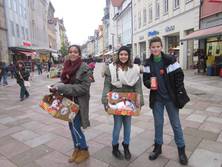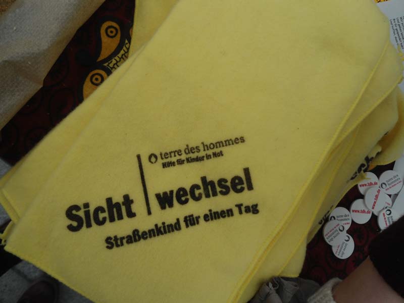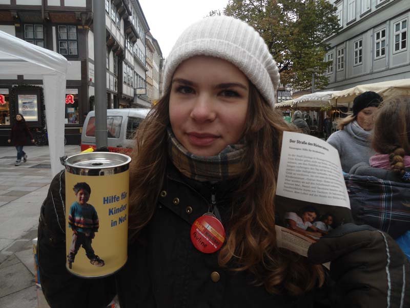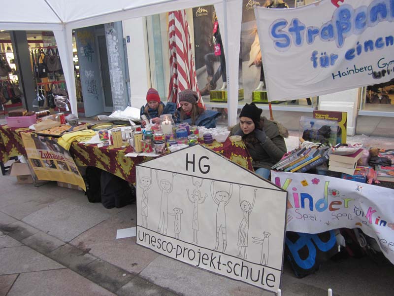Am Freitag, den 22.11.2013 war unser WPU-8 vom Hainberg Gymnasium in der Fußgängerzone, wir haben auf die Situation von Straßenkindern weltweit aufmerksam gemacht. Dazu haben wir Schuhe geputzt und in Bauchläden selbst gebastelte und selbst gebackene, wie zum Beispiel Kuchen verteilt. Dies ist eine jährliche Aktion von terre de hommes. Durch diese Aktion habe ich erfahren, wie es sein muss als Straßenkind sich täglich durchs Leben zuschlagen. Für mich wäre das schlimmste der tägliche Kampf ums Überleben, weil sie nie wissen ob sie diesen Tag überleben, ob sie was zu essen bekommen oder von der Polizei verjagt oder sogar getötet werden. Die schlimmsten Akpekte am Straßenkind dar sein sind erstens Angst beim einschlafen vor dem nächsten Morgen, der vielleicht den Tod bedeutet und zweitens das Gefühlschaos durch Trauer, Hoffnungslosigkeit, Einsamkeit und vieles mehr. Durch medizinische Unterversorgung, Kälte und schmutzige Umgebung sind diese Kinder oftmals schlimmen Krankheiten ausgesetzt. Die Passanten die wir über diese schlimmsten Bedingungen von Straßenkindern haben sehr unterschiedlich reagiert. Viele haben sich ehrlich Ergriffen gezeigt und großzügig gespendet, während sich andere abweisend zeigten und uns nicht zuhören wollten. Unsere eingenommenen 850 Euro haben wir allein durch freiwillige Spenden gesammelt. Ich werde mich auch weiterhin dafür einsetzten, dass jedes Kind die gleichen Chancen auf ein schönes und sorgenfreies Leben bekommt und damit die hohe Anzahl von Straßenkindern sinkt. (Lili)