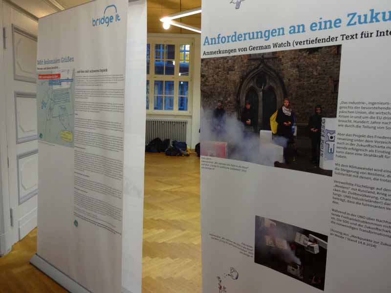 2) Herr Müller von bridge-it! umreißt kurz bridge-it! und bettet damit die Veranstaltung in die Dialog-Tour ein. Er wird die Brücke vom Fairen Handel zu den Themen der Millenniumsentwicklungsziele, wie weniger Armut, Hunger und Ungerechtigkeit.