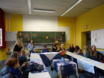 Wie wichtig es aktuell für die Integration von Flüchtlingsfamilien ist, hinzuschauen, sich einzumischen und ehrenamtlich zu engagieren, stellten die Schülerinnen Lea Ella Wittig und Svenja Richards in der dem Netzwerk Mensch zur Verfügung gestellten Wohnung in Unteroker dar. Sie beschrieben die dort stattfindenden Angebote und erzählten, ergänzt durch die Schüler Nina Kaulfuß, Jelena Hoffmeister und Max Breust, an welchen dieser Aktivitäten sie sich während ihrer Freizeit beteiligen z. B. bei der Kleiderbörse, dem gemeinsamen Kochen mit geflüchteten Jugendlichen oder beim kürzlich stattgefundenen Frühlingsfest. „Gemeinsame Aktivitäten sind ein wichtiger Weg zur Integration und sie machen mir einfach Freude“, so Lea Ella Wittig. Herzlich empfangen wurden die Gäste von Anja Voges, Frontfrau des Netzwerkes.