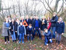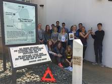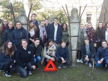 Im Anschluss an diese erste Präsentation in der Schule selbst machten sich die Gastgeber von der AGG zusammen mit ihren Gästen auf zum nahegelegenen André-Mouton-Platz auf. Dort stellten die Schüler Maximilian Dörr und Ralf Hake die Biographie von André Mouton vor, der als junger Mann im Jahr 1943 als Angehöriger der französischen Résistance von den Nationalsozialisten verhaftet und in die Konzentrationslager in Deutschland verschleppt wurde. Er überlebte im Gegensatz zu vielen seiner Mitgefangenen die Zwangsarbeit im KZ Mittelbau Dora bei Nordhausen. Im April 1945, als die SS das Lager räumen ließ, gehörte André Mouton zu einer Gruppe von mehreren Tausend Häftlingen, die von ihren Bewachern in einem Todesmarsch von Osterode über Clausthal nach Oker getrieben wurden. An diesen Marsch erinnern heute Stelen, die auf der Marschroute aufgestellt wurden, und von denen eine auch am André-Mouton-Platz in Oker steht. Die Schüler berichteten ihren Gästen von diesem schrecklichen Ereignis, das die beiden Schulorte, Osterode und Oker, gleichermaßen betraf. Sie erinnerten daran, welches Leid während der Herrschaft der Nationalsozialisten geschehen war, gerade weil viele Menschen sich nicht oder zumindest nicht oft genug eingemischt hatten und richteten einen Appell an alle Anwesenden, sich heute bei jeder Art von Unrecht mutig einzumischen.