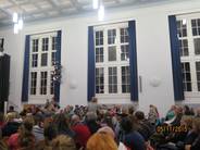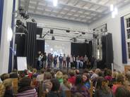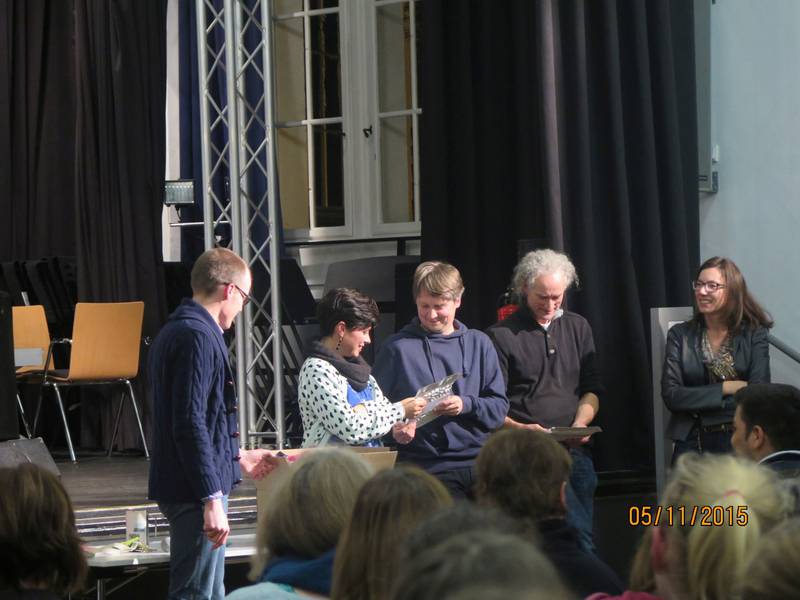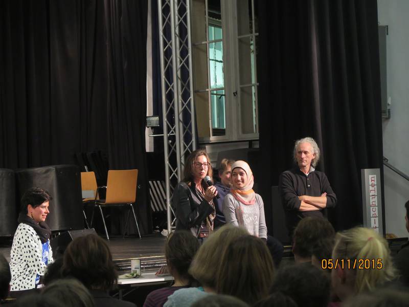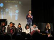 Am Donnerstag, den 05. November 2015 gab es am Hainberg Gymnasium zwei sehr gut besuchte Vorstellungen des Filmes „Morgenland“, der in Zusammenarbeit mit den Jugendlichen des „Boat people projektes“ entstanden ist. Während es morgens eine schulinterne Vorstellung vor allem für den gesamten zehnten Jahrgang gab, war abends die Aula für alle InteressentInnen offen. Erfreulicherweise fanden auch hier ca. 150 Menschen ihren Weg ins Hainberg Gymnasium. Während vormittags nur zwei der Darsteller anwesend sein konnten, waren abends fast alle DarstellerInnen des Filmes persönlich anwesend, zudem standen (wie auch schon vormittags) die MacherInnen des Filmes (Regie: Sonja Elena Schröder und Thomas Kirchberg, Text: Luise Rist, Musik: Hans Kaul) Rede und Antwort. Alle ZuschauerInnen erlebten einen sehr emotionalen Abend, der dennoch nie ins Pathetische abglitt. Nach dem Film, in dem Jugendliche aus Afghanistan, Eritrea, Kurdistan, Somalia und Syrien, die inzwischen in Göttingen leben, ihre Lieblings- und Sehnsuchtsorte vorstellen, gab es noch Livemusik: Hans Kaul begleitete Abiwahad Abdi aus Somalia und Bushkin Ali aus Syrien am Klavier und fast alle Jugendliche des „Boat people people“ standen am Ende des Filmes gemeinsam auf der Bühne. Eine besondere emotionale Note bekam der Abend dadurch, dass Bushkins Mutter anwesend war, die erst vor einer Woche mit dem Rest der Familie den gefährlichen Weg von Syrien nach Deutschland hinter sich gebracht hatte. Als Bushkin auf der Bühne das erste Lied seiner Mutter widmete, die an dem Tag auch noch Geburtstag hatte, war die Stimmung in der Aula des Hainberg Gymnasiums ein schönes Abbild der viel beschworenen Willkommenskultur- und so manches Auge wurde feucht.