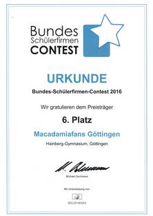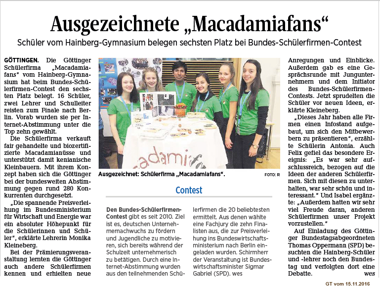 Am 11.11.2016 war es wieder soweit. Die beste Schülerfirma Deutschlands wurde im Rahmen des Bundes-Schülerfirmen-Contest 2016 im Berliner Wirtschaftsministerium gekürt. Auch in diesem Jahr haben auch wir mit unserer Schülerfirma Macadamiafans an der Veranstaltung teilgenommen. Danke noch mal an alle, die uns per online-voting unterstützt haben!! So ist es uns gelungen, in die Vorauswahl zu kommen - allerdings bestimmte dann eine Jury, in der auch ehemalige Preisträger mit sitzen, wer die Gewinner sind.