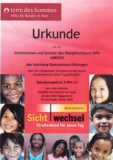 Am 21.11.2016 sammelten Schülerinnen und Schüler der UNESCO AG Jg 5/6 und des WPU UNESCO Jg. 8 Spenden in der Innenstadt. Mit Müllsäcken bekleidet und mit Bauchläden und Schuhputzzeug ausgerüstet, sprachen sie viele Passanten an, die teilweise unfreundlich aber auch freundlich und spendabel reagierten, was man Endbetrag von knapp 900 Euro gut erkennen kann. Die Armbänder, Teelichter und Karten, die die Schüler gegen Spenden verschenkten, wurden am vorausgehenden Blockwochenende in der Vorbereitung von den Schülern selbst gestaltet. Die Spendenaktion für Straßenkinder in Mosambique wurde von Terre des hommes initiiert. Das Göttinger Tageblatt begleitete die Schüler und Schülerinnen den Tag über. (Victoria und Chiara)