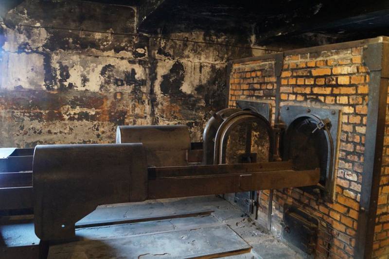 Krematorium in Auschwitz: Einige Gefangene wurden in Auschwitz für Sonderkommandos abkommandiert, um die Toten aus den Gaskammern zu holen. Zuerst begrub man die Opfer noch, doch die NS-Führer hielten die Verbrennung für effektiver und hygienischer. Krematorien (Verbrennungsanlagen) wurden gebaut. Es waren riesige Öfen und sie fassten mehrere Leichen. Manchmal versagten die Öfen, weil sie die Vielzahl der Leichen nicht bewältigen konnten. Im Sommer 1944, als täglich bis zu 20 000 Menschen in Auschwitz vergast wurden, hob man zusätzliche Verbrennungsgruben im Freien aus.