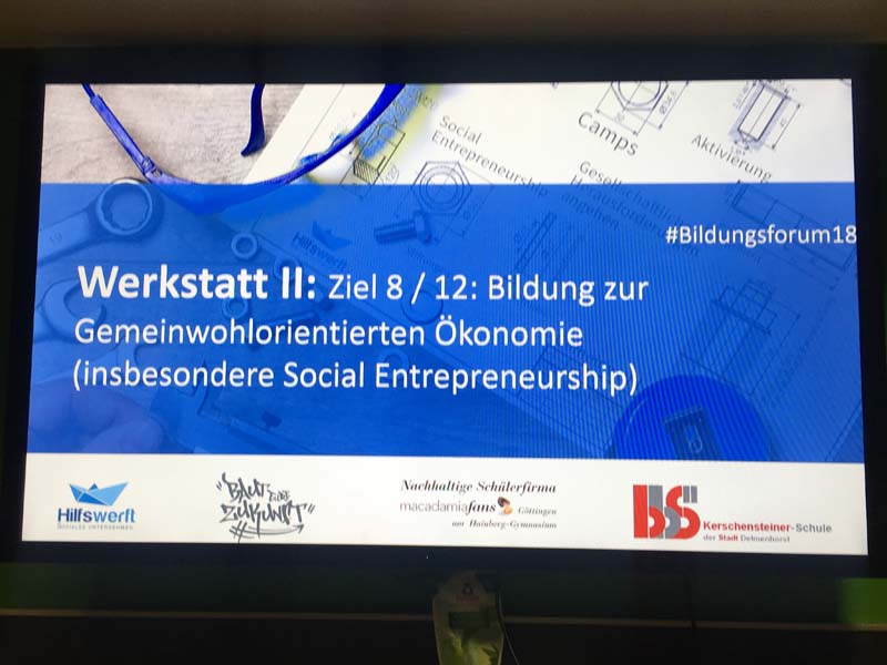 In der Werkstatt „Gemeinwohlorientiertes Wirtschaften“ gibt eine praxisnahe Einführung in das Social- Entrepreneurship-Konzept. Gesellschaftliche Probleme unternehmerisch angehen und einen Beitrag zur Gestaltung der Zukunft leisten – das können auch Schüler und Schülerinnen lernen. Wir möchten die Teilnehmer als Botschafter für ein alternatives Wirtschaften gewinnen. Zusammen mit Praxispartnern, wie der Nachhaltigen Schülerfirma "Macadamiafans Göttingen" stellen wir Optionen zur Kompetenzvermittlung vor. Wir setzen uns mit diesem Phänomen auseinander und erproben in der Runde, wie Ideen zur Weltverbesserung sozialunternehmerisch umgesetzt werden können. Moderation: Hilfswerft gGmbH