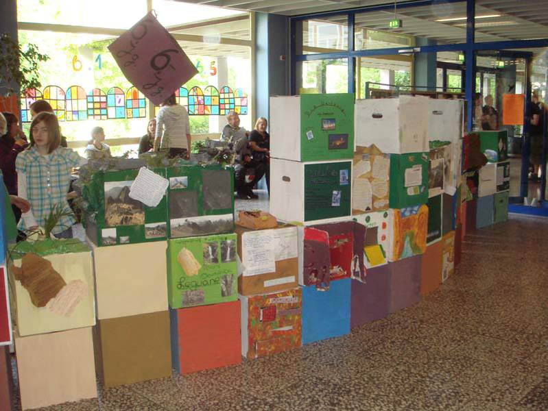 Die Ergebnisse des 10. Jahrgangs waren sehr vielfältig. Die Schülerinnen und Schüler des gesamten Jahrgangs hatten sich mit ihrer eigenen Herkunft - ihren Wurzeln [mehr] - in den Fächern Religion, Gesellschaft und Kunst auseinandergesetzt und begehbare Modelle zu einzelnen Welterbestätten aufgebaut und mit zahlreichen Informationen versehen. Eine Gruppe von Schülerinnen und Schülern hatte zusätzlich DIN A 4 – Aktenordner zu einzelnen Welterbestätten gestaltet.