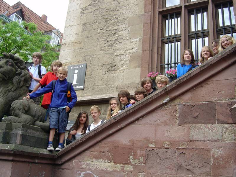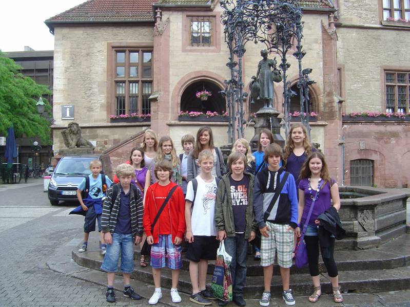 On the picture we are at the old town hall of Göttingen. This was our meeting point after we took an exciting guided tour in English through our city. It was a project of our school with the UNESCO- theme: Building our Future. To our surprise it wasn't so difficult to understand the information. On our tour we stopped at seven sights like Gänseliesel, Junkernschänke, Aula or Börnerviertel. Our tour guide Mrs Sauter explained us our history. It was very interesting and at the end we had one hour time to go to one place each and write questions and texts for English speaking kids on tour in Göttingen.