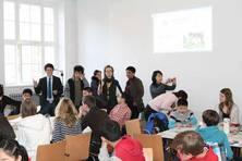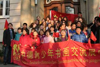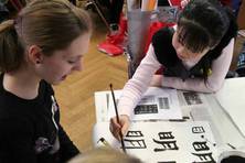 Sie nahmen an einem Kalligraphie-Workshop teil, in dem sie von 6 – 17jährigen chinesischen Kalligraphieschülerinnen und –schülern in die traditionelle chinesische Schreibkunst eingeführt wurden.