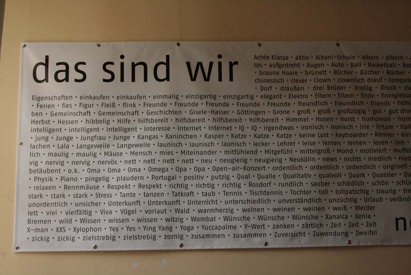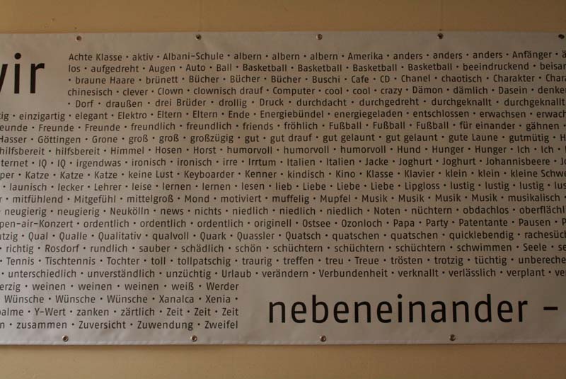 Die Darstellung der Hauptwörter geschah später nicht durch unterschiedliche Farbe und Größe, sondern im Quadrat und wurde auf ein großes Banner gedruckt. Alle Wörter (alphabetisch von den Schülern geordnet) sind gleich wichtig. Schülerinnen und Schüler initiieren einen Prozess, in dem ihre Themen zu Tage gefördert und zu einem Schrift-Bild gestaltet werden, in dem sie selbst anschaulich werden.
