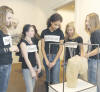 | Stummer Aufruf“: Patrizia, Lara, Onyeka, Hannah und Jana (v.li.), Schülerinnen des Hainberggymnasiums Göttingen vor dem Objekt „Kopf, gebunden“ von Waltraud Stalbohm. Heller |