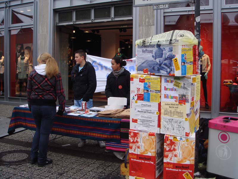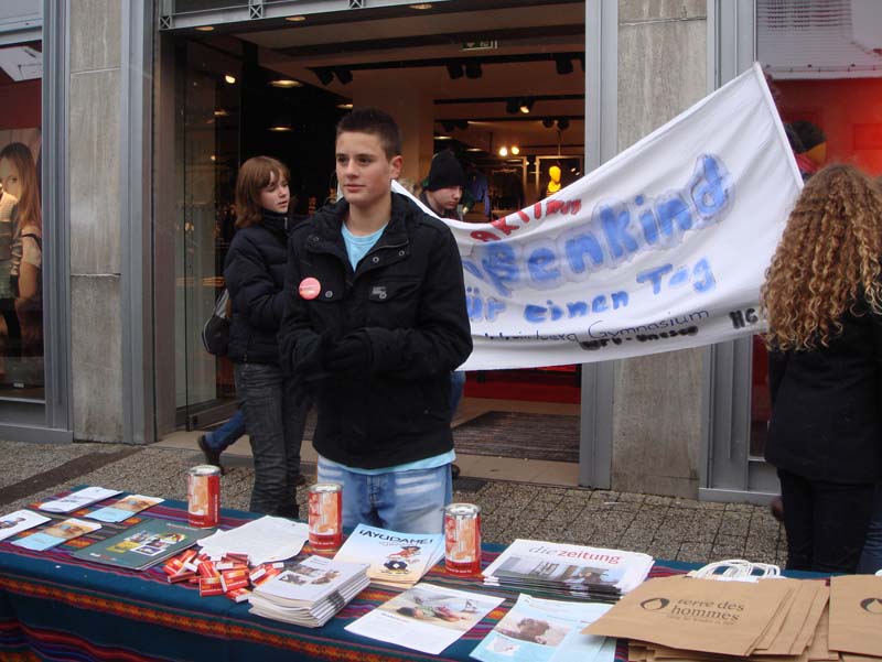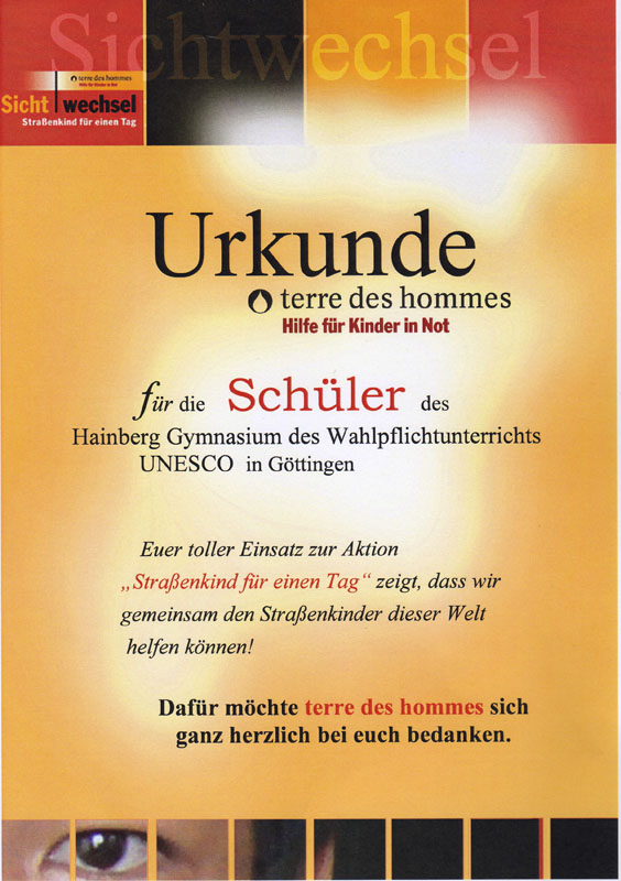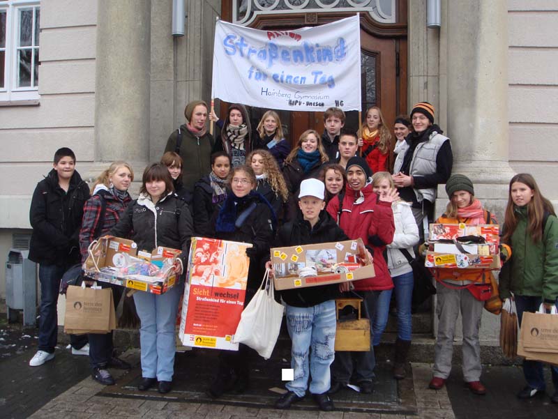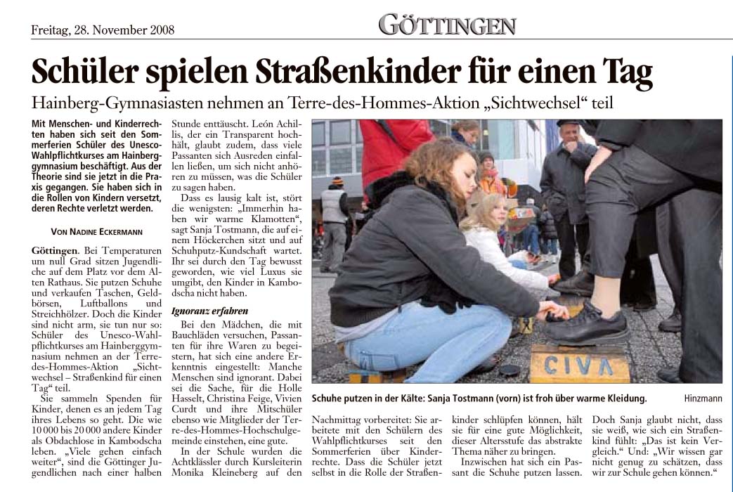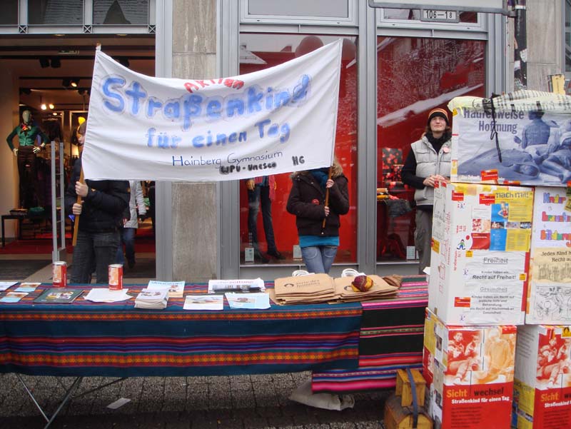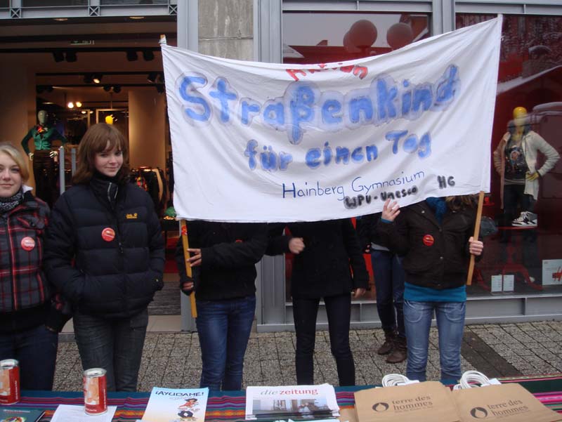 In Göttingen werden 19 Schülerinnen und Schüler des Hainberg-Gymnasiums (Wahlpflichtkurs UNESCO, Jahrgang 8) am 24. November 2008 Schuhe putzen, Papiertaschen verkaufen und einen Info-Stand am Alten Rathaus errichten. Ziel der Aktion ist es, auf die Situation der Straßenkinder aufmerksam zu machen und Spenden für Straßenkinderprojekte zu sammeln. Unterstützt werden sie hierbei von der terre des hommes Hochschulgruppe der Uni Göttingen.