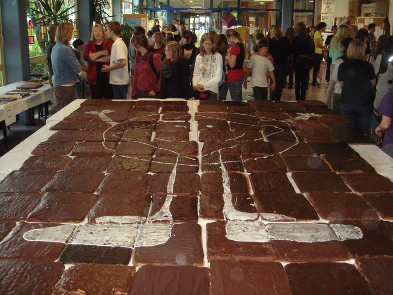 Die Eltern der RBG hatten ca. 100 Blechkuchen mit Schokoladenüberzug gebacken und Schülerinnen und Schüler des 10. Jahrgangs hatten mit Zuckerguss das Welterbe-Logo darauf dekoriert. Der Erlös aus dem Kuchenverkauf ging in die UNESCO-Kasse.
